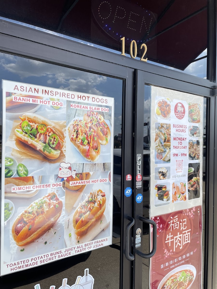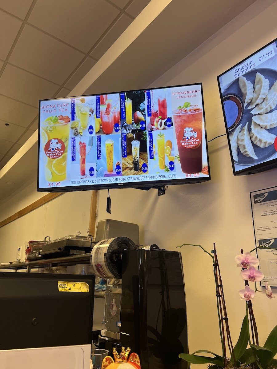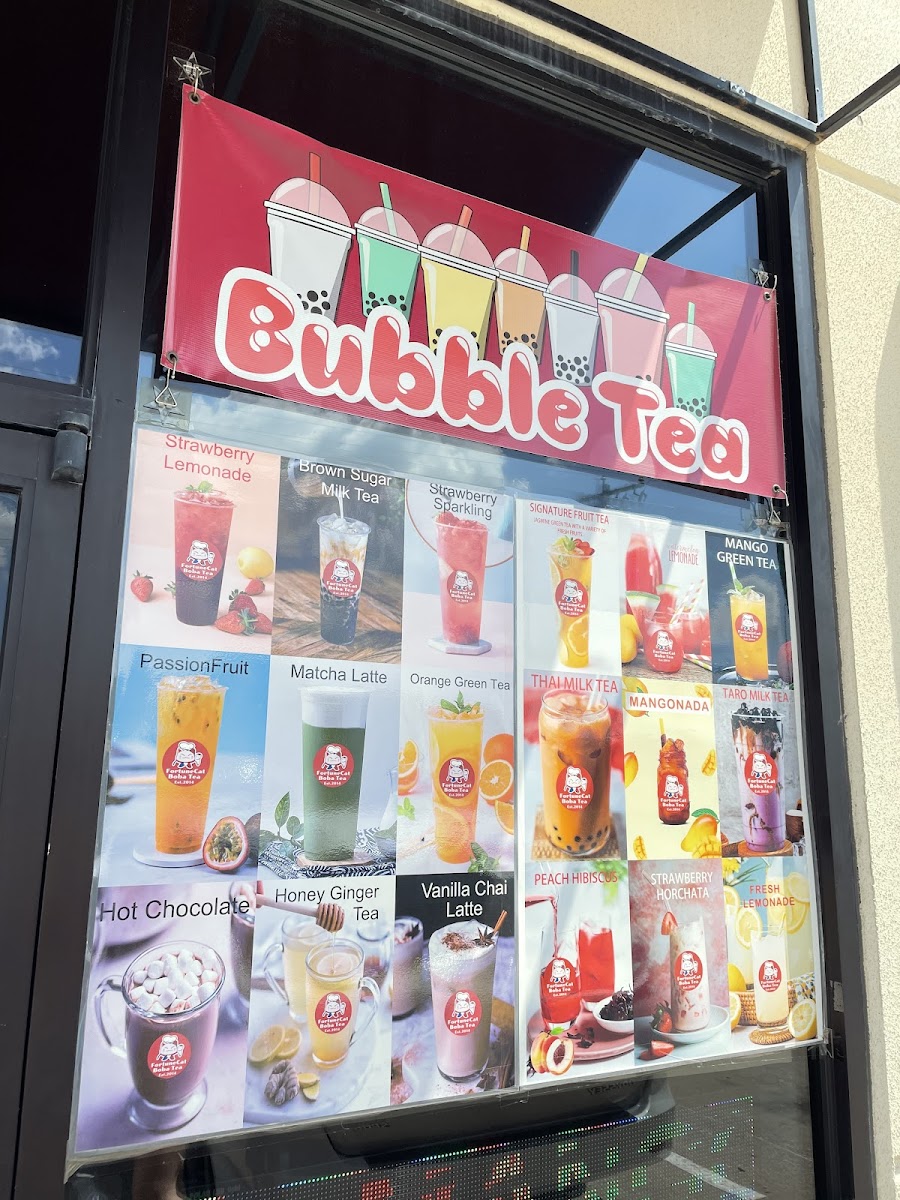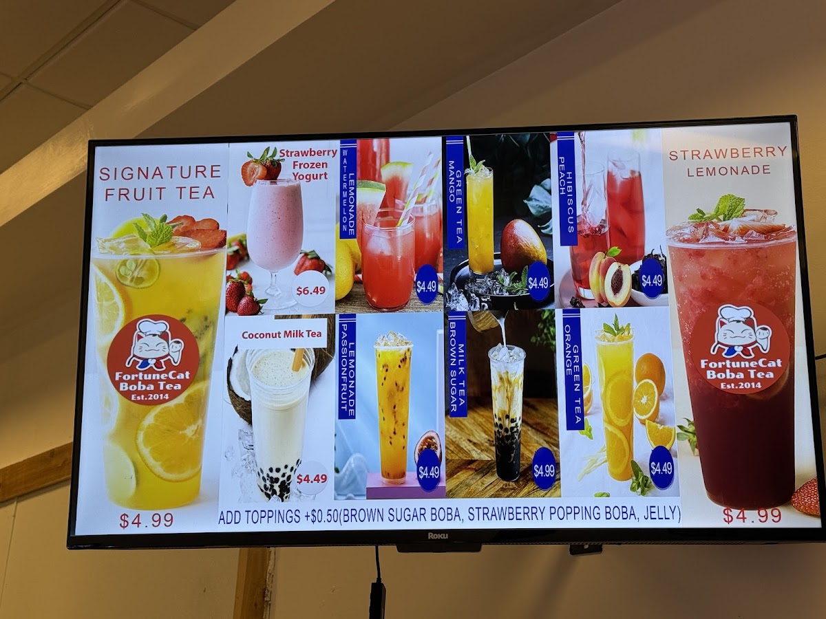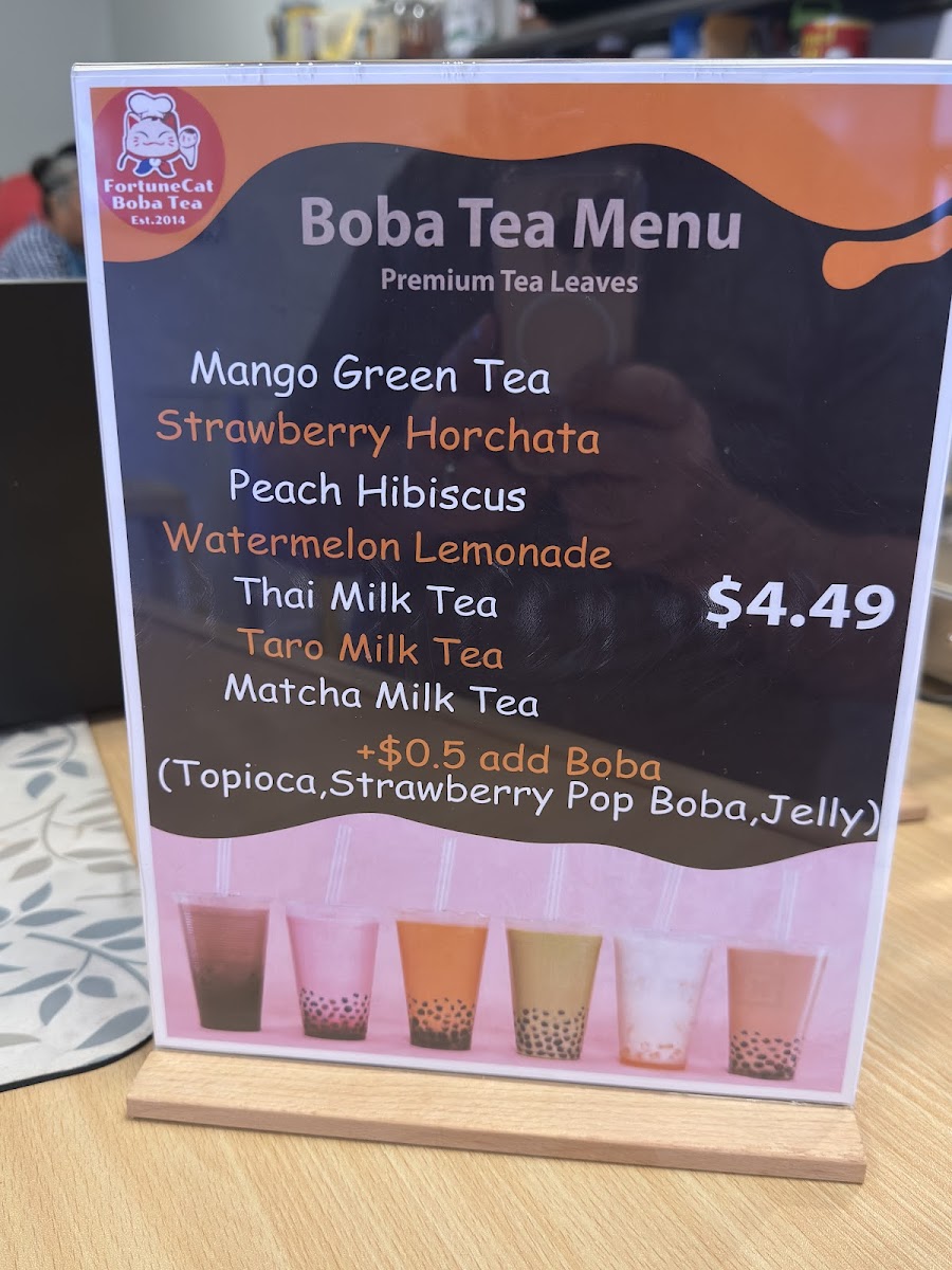 Drinks: The beverage selection includes several milk tea options such as Taro Milk Tea with Brown Sugar Boba, Matcha Milk Tea with Brown Sugar Boba, Thai Milk Tea, and Brown Sugar Boba Milk Tea. There are also fruit-infused teas like Orange Green Tea, Honey Lemon Tea, Peach Hibiscus, Mango Green Tea with Brown Sugar Boba or Strawberry Popping Boba, and Super Fruit Tea. Prices generally range around US$4.49 to US$4.99.